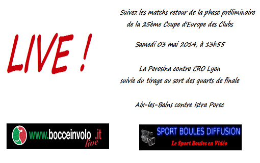 A suivre, Samedi prochain 3 Mai 2014 : 2 Directs vidéo : Matchs Retour AIX LES BAINS (FRA) - BK ISTRA POREC (CRO) et S.B. LA PEROSINA (ITA) - CRO LYON (FRA)