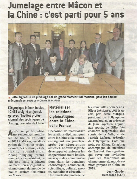 Je remercie Jean Patrick Courtois, Maire de Mâcon, Jean Payebien, Adjoint aux Sports, Pierre Marquis et Patrick Lafarge de l’Olympique Mâcon Boules qui ont immédiatement accepté de faire ce jumelage avec une ville chinoise.